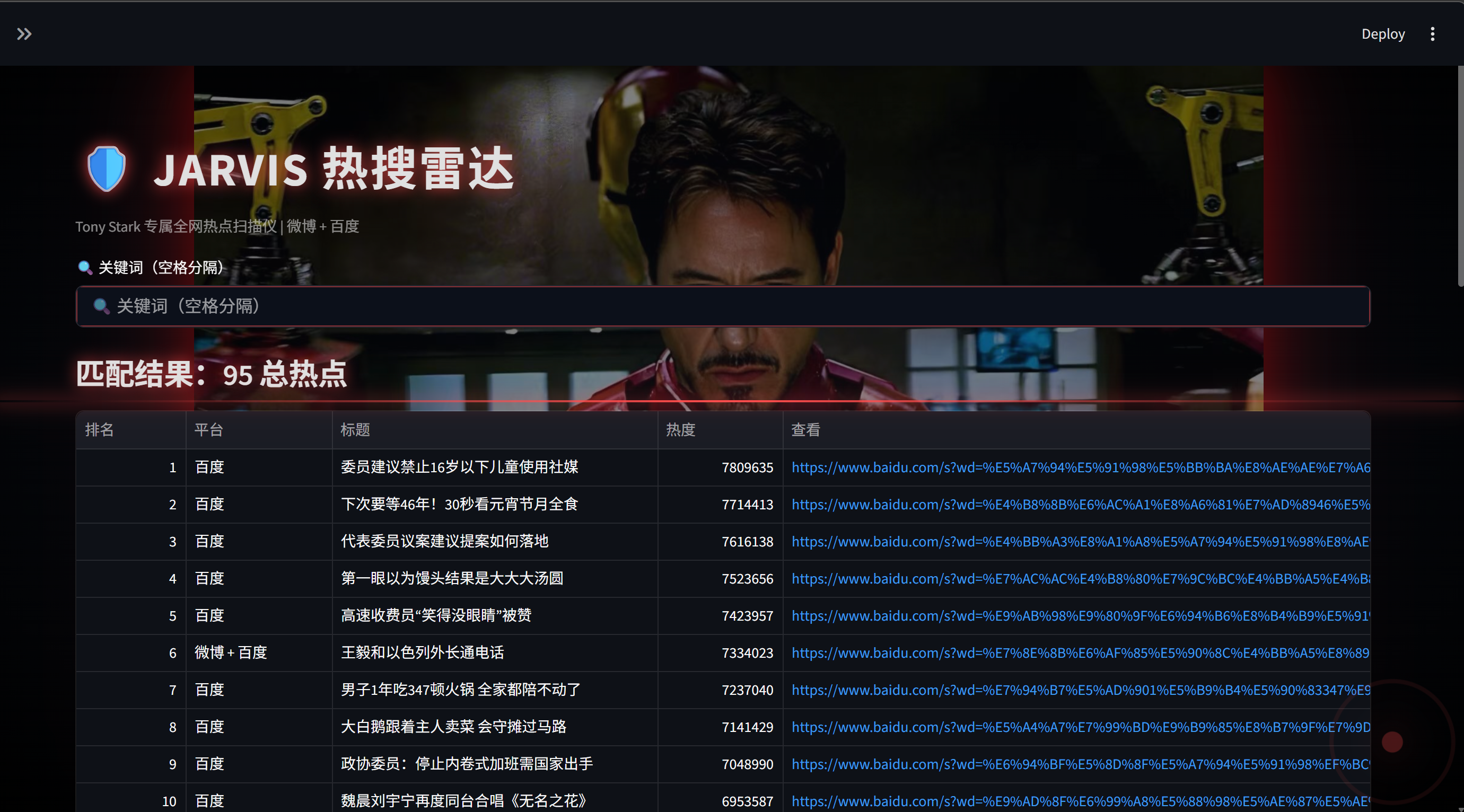 为了解决这个问题,我用 Python 写了一个 JARVIS 热搜雷达。它每天自动抓取微博和百度热搜,智能去重合并,生成日报、推送企业微信、提供交互式网页看板,还能语音播报关键词命中情况。全程自动化,就像钢铁侠的智能管家。