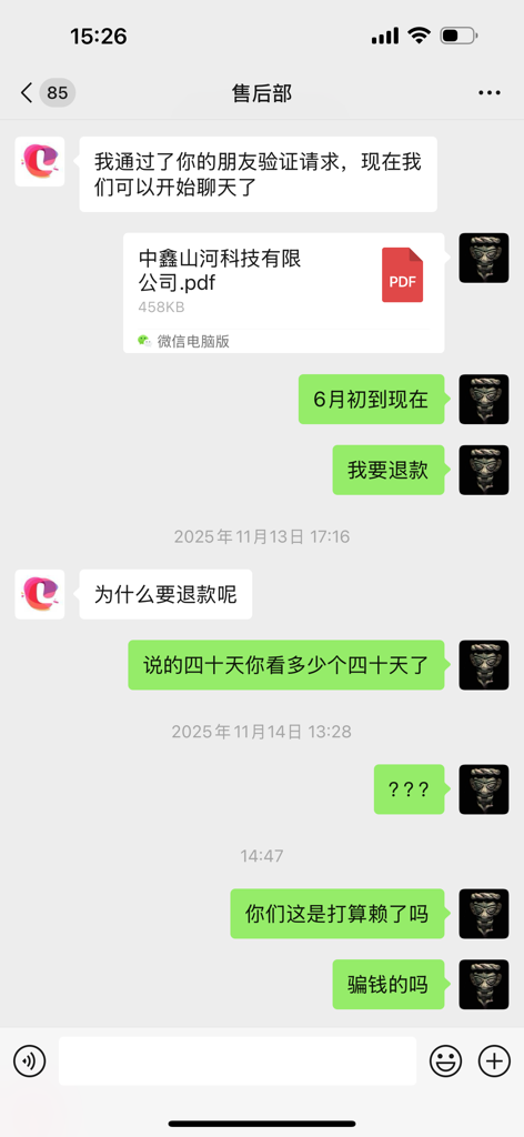 这家据称著名的小程序、游戏开发公司,25年6月9号签订的合同,说40天可以交付测试版本,现在快7个月了 毛都没有,客服好像口吃一样只会打哈哈…避雷啊 公司名是 中鑫山河科技有限公司,河南郑州的。